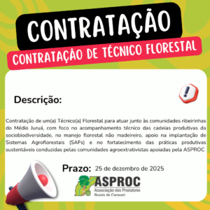 A ASPROC atua na promoção do desenvolvimento sustentável, na melhoria da qualidade de vida das famílias agroextrativistas do Médio Juruá e no fortalecimento das cadeias produtivas da sociobiodiversidade. Para isso, busca um(a) profissional qualificado(a) que contribua para a eficiência organizacional e o bom funcionamento da equipe.